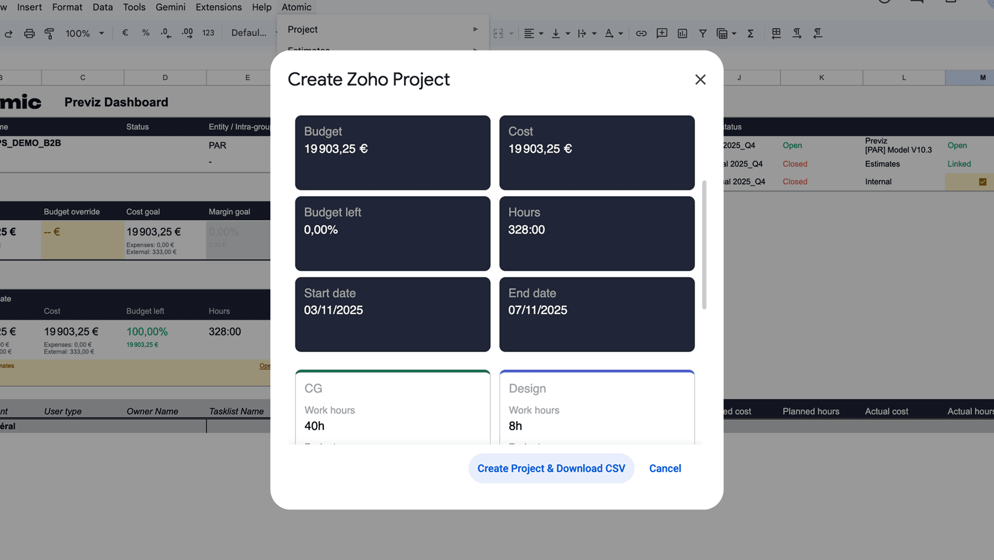Côté production, les informations centralisées dans Sheets permettent de générer automatiquement un projet dans Zoho Projects avec les tâches préalablement estimées.