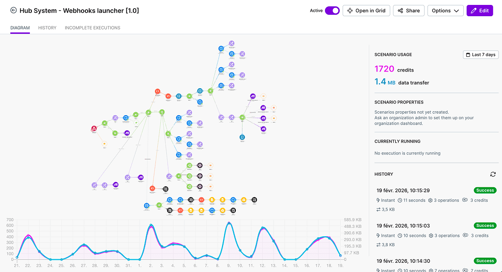 Utilisation de Make pour contrôler certaines automatisations complexes, faciliter la maintenance et accélérer les itérations.