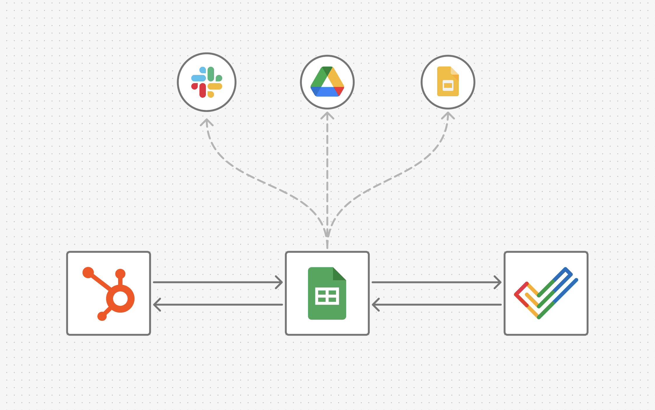 HubSpot, Zoho Projects, Slack et Google Drive sont connectés via leurs APIs, assurant la synchronisation des données et la fiabilité des échanges.