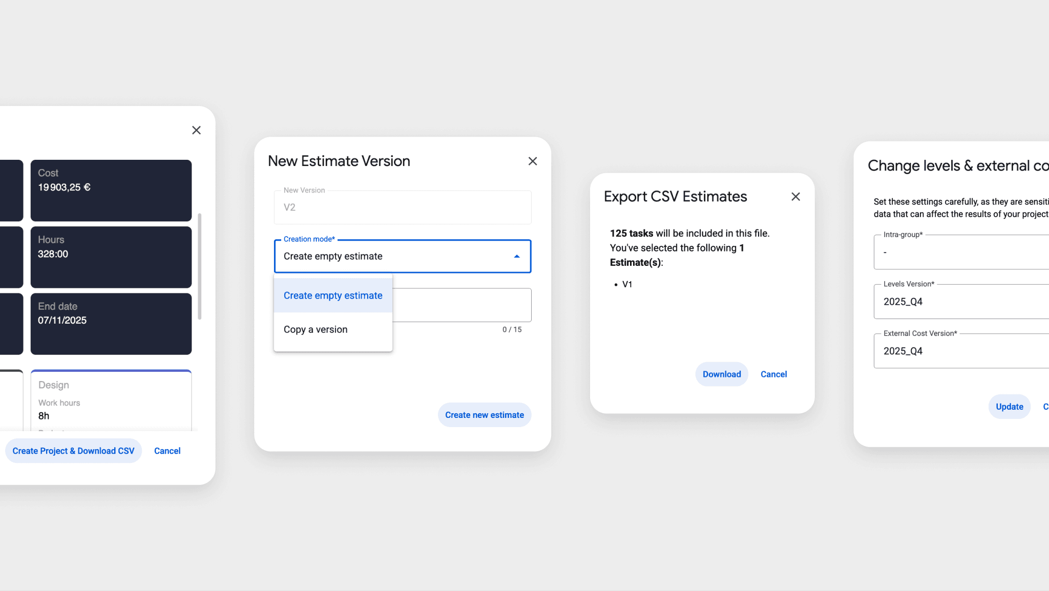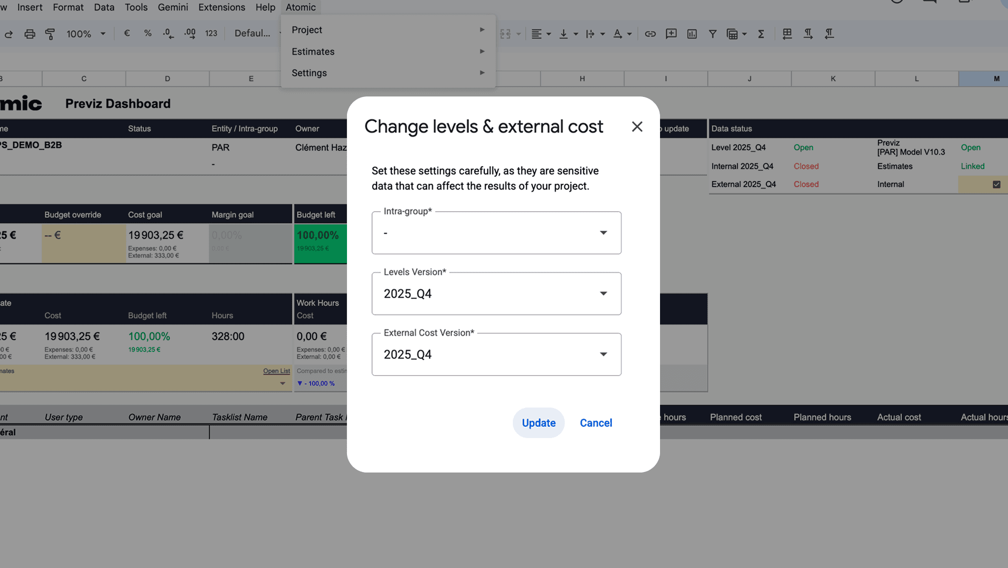 Un point clé du design a été de préserver la continuité visuelle et fonctionnelle avec Google Sheets. Les interfaces intégrées (menus, popups, actions) ont été conçues à partir des composants Material Design, afin de rester alignées avec l’environnement natif de Google. L’objectif était d’éviter toute rupture visuelle et de favoriser une adoption immédiate par des équipes déjà familières de l’outil.